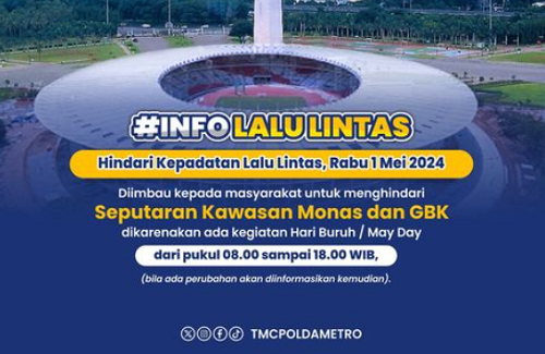 KabarIndonesia.id — Peringatan Hari Buruh (May Day), Ditlantas Polda Metro Jaya mengimbau masyarakat dan para pengendara untuk menghindari jalan di seputar Gelora Bung Karno (GBK) dan Patunng Kuda, Silang Monas, Jakarta Pusat, Rabu, (01/05).