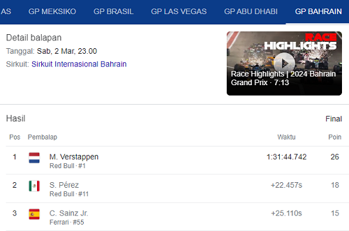 KabarIndonesia.id — Pembalap Red Bull, Max Verstappen memenangi Formula 1 GP Bahrain 2024 sebagai seri pembuka musim di Sirkuit Internasional Bahrain, Sabtu, (02/03).