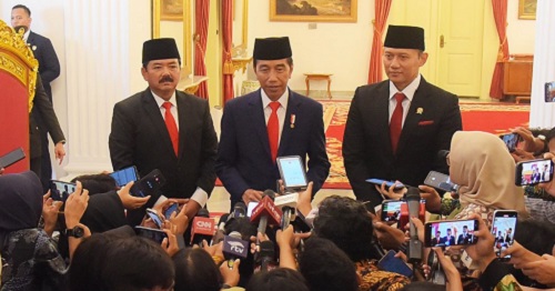 KabarIndonesia.id — Presiden RI Joko Widodo (Jokowi) melantik Hadi Tjahjanto sebagai Menteri Koordinator Bidang Politik, Hukum, dan Keamanan (Polhukam) dan Agus Harimurti Yudhoyono (AHY) sebagai Menteri Agraria dan Tata Ruang (ATR)/Kepala Badan Pertanahan Nasional (BPN), di Istana Negara, Jakarta, Rabu (21/02).