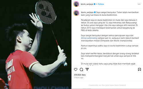 Kevin menyampaikan alasan mundurnya dari Pelatnas PBSI melalui unggahannya di akun Instagram pribadinya @kevin_Sanjaya.